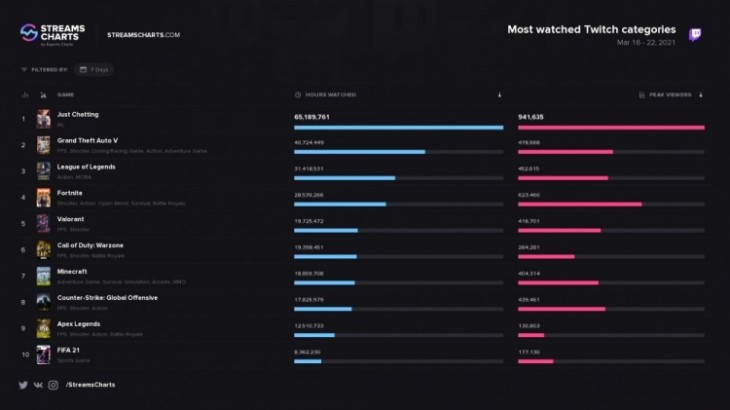 北京时间3月24日讯 今日Twitch周榜更新,just chatting毫无悬念,继续领跑榜首(聊天软件);值得一提的是,GTA5的观看时长超过了4000万个小时,暂居第2,,以下是详细榜单排名: