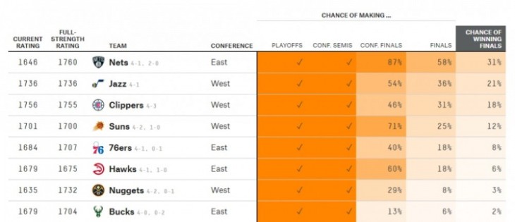 FiveThirtyEight预测夺冠概率最高的则是篮网(31%),其次则是爵士(21%)、快船(18%)、太阳(12%)。