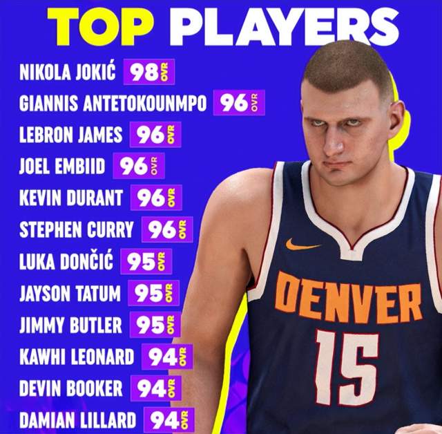 具体2K24球员评分前12名:约基奇98分、詹姆斯 96分、阿德托昆博 96分、恩比德 96分、杜兰特 96分、库里 96分、东契奇 95分、塔图姆 95分、巴特勒 95分、伦纳德 94分、布克 94分、利拉德 94分