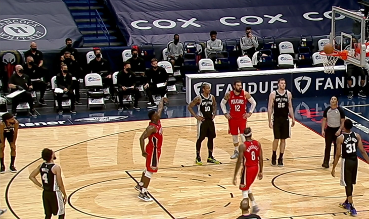 NBA常规赛马刺对阵鹈鹕,两队分居西部第十和第十一位。开场后鹈鹕主要依靠锡安、鲍尔和英格拉姆是三分拿分,马刺在德罗赞带领下通过整体配合取得领先。第二节回来鹈鹕外线找到手感一路缩小分差到1分,不过锡安和鹈鹕其他内线实在罚球差劲,马刺也通过外线三分稳住阵脚并拉开比分,上半场马刺61-52领先鹈鹕。下半场英格拉姆手感火热接连投篮命中,鹈鹕的轮换阵容也跟着发挥追上比分,第四节场面仍旧十分胶着,虽然鹈鹕一度完成反超,但马刺马上咬住比分。德罗赞最后关头命中关键中投,鲍尔三分不中,最终马刺110-108力克鹈鹕。
