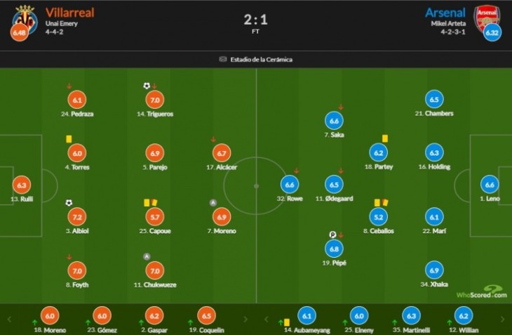 北京时4月30日讯 在刚刚结束的一场欧联半决赛中,阿森纳客场1-2不敌比利亚雷亚尔,在赛后的whoscored评分中,打入一球的黄潜中卫阿尔比奥尔获得了全场最高的7.2分。