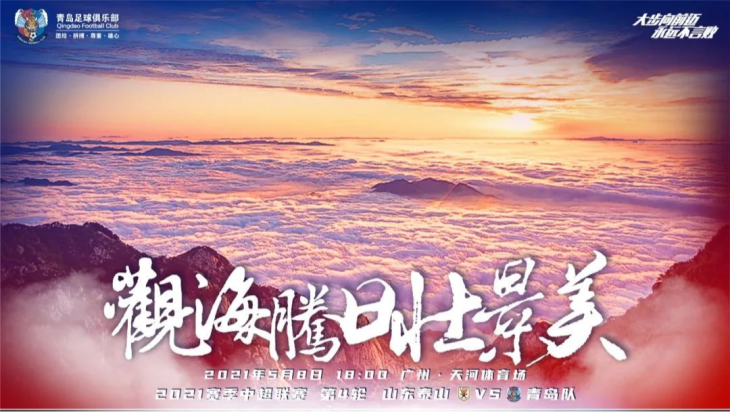 北京时间5月6日讯 5月8日18点,青岛队将在中超第四轮比赛中对阵山东泰山。球队在今晚发布了本场比赛的赛前海报:观海腾日壮景美。