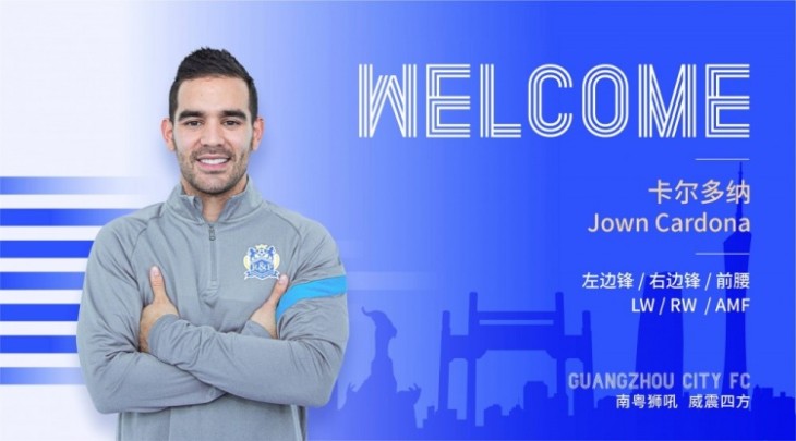 经我俱乐部与哥伦比亚籍球员乔恩·卡尔多纳(Jown Anderson Cardona Agudelo)友好协商,双方达成一致,从即日起,卡尔多纳(粤语译名:卡度拿)正式加盟广州城足球俱乐部,双方签订了一份为期三年的工作合同。新赛季卡尔多纳将身披7号球衣代表广州城队出战。